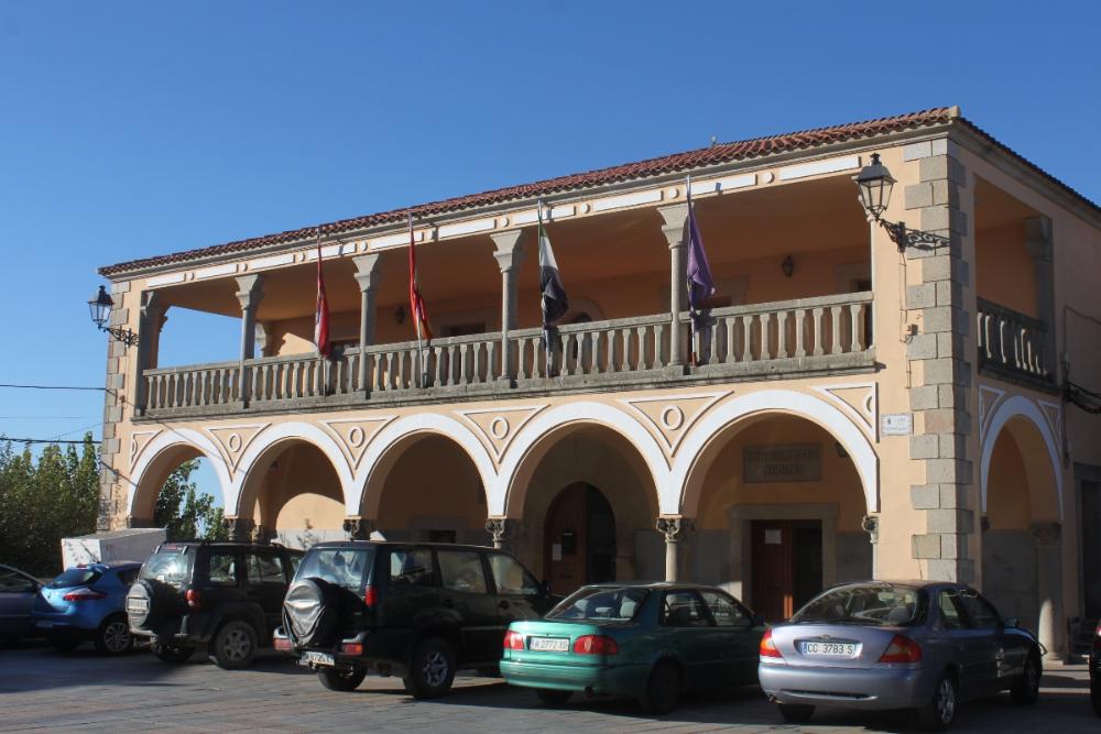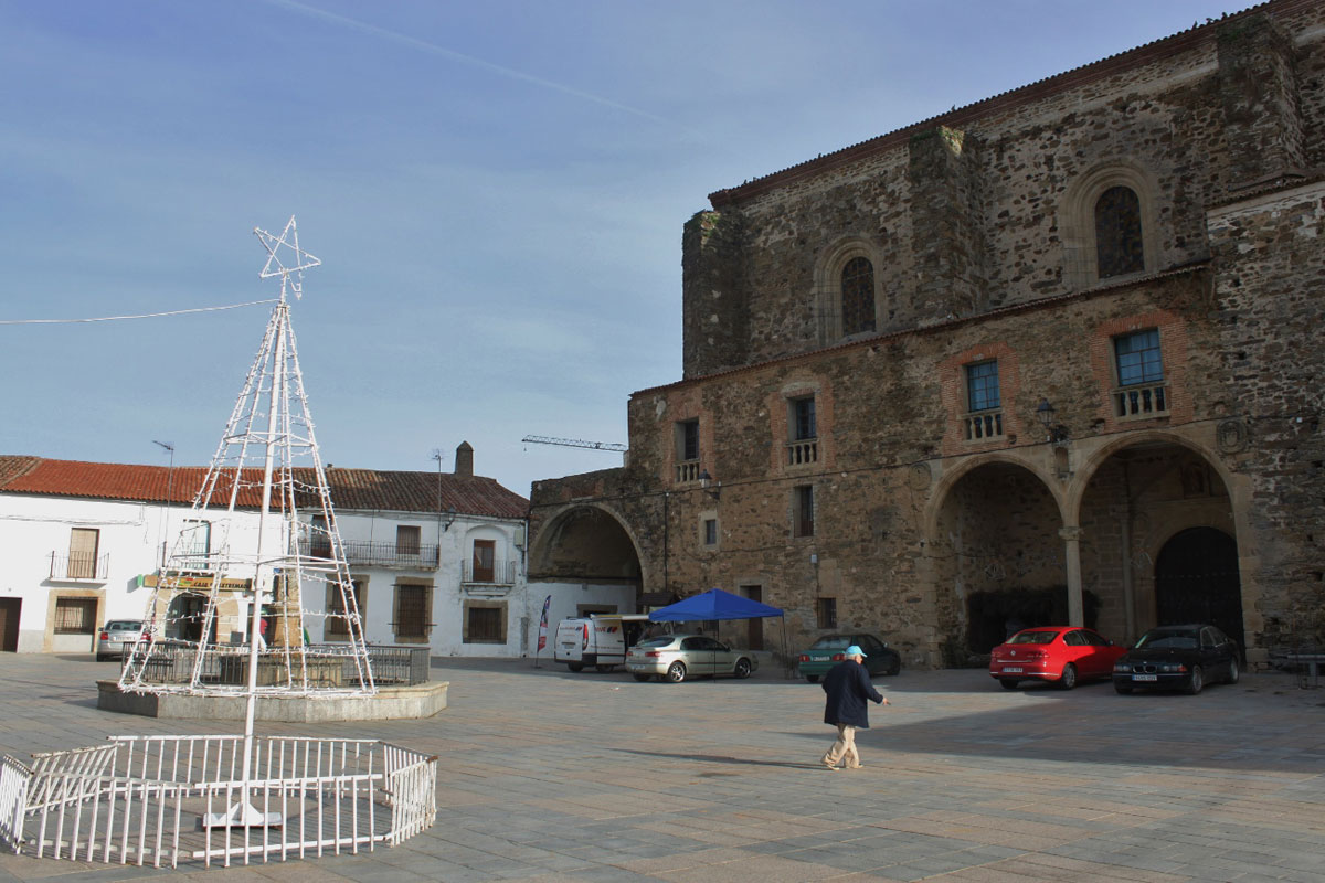 La magnífica iglesia de Nuestra Sra. de la Asunción ocupa un lado completo de la plaza, que cierra ese lado con un gran arco que sale hacia la calle Talavera. En el otro lado se pueden observar algunas portadas de granito y las dos torres que conserva el recinto. Enfrente de la iglesia está el Ayuntamiento, edificio de gran porte, concebido como Pósito Municipal y otras casas de notable envergadura. La parte que nos queda está abierta a dos calles principales.