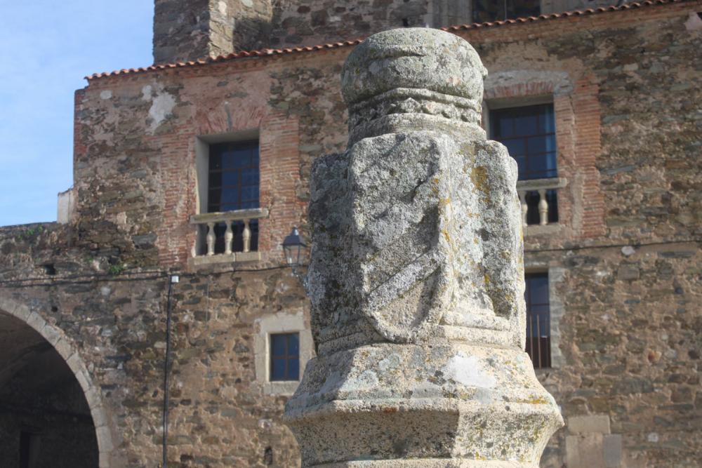 Nos queda la parte superior del símbolo de Villa de la población. Denota un la mezcla entre el clásico poder civil y el fuerte carácter religioso que aúna Jaraicejo al ser un Señorío Obispal. Las bandas del los Vargas decoran el escudo, nos falta todo el monolito que alzaba este gracioso remate hasta, al menos los tres metros.