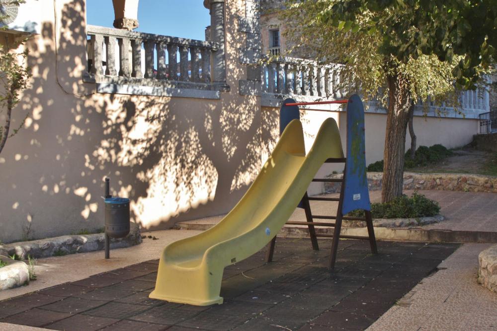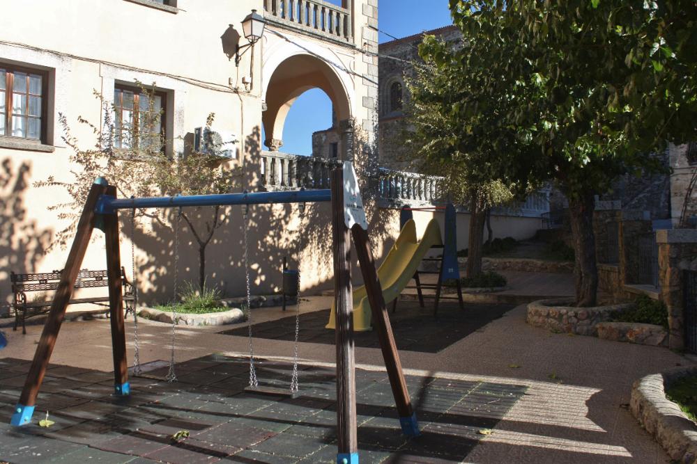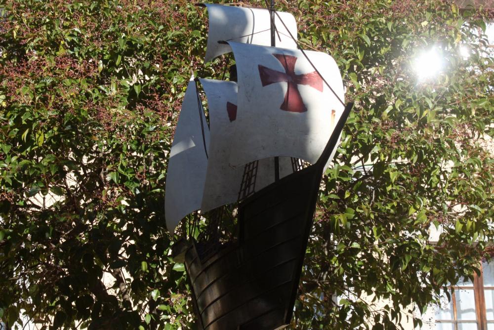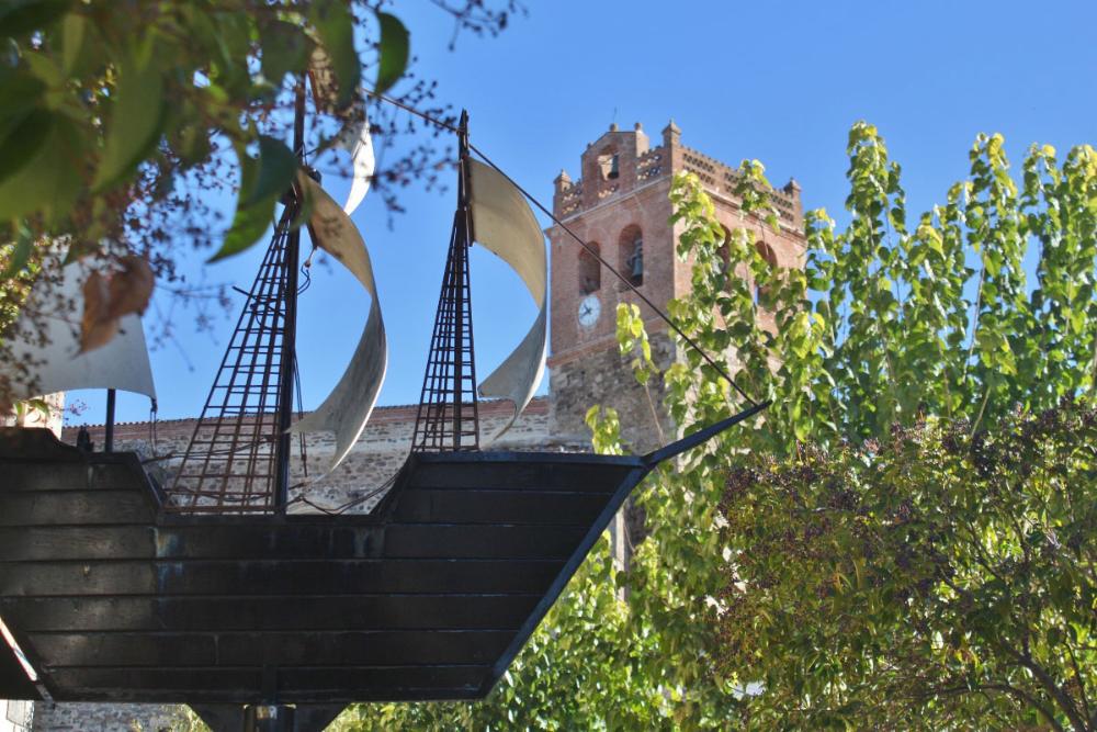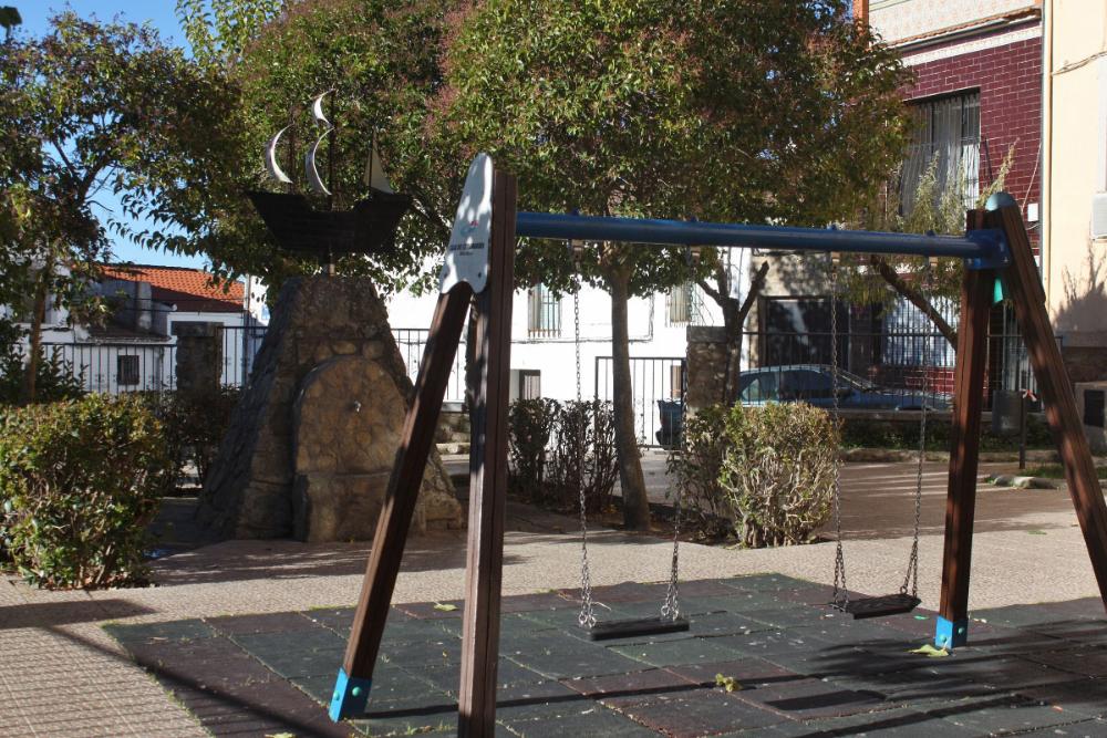 El parque se instala en una terraza intermedia entre la plaza y la calle del castillo. No es grande, pero sí muy coqueto: bellamente ajardinado y con una escultura central de un barco, concretamente una carabela como las del descubrimiento de América.