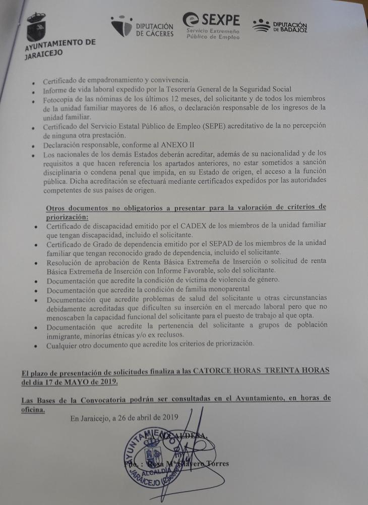 Buenos días, está abierto el plazo para la presentación de solicitudes para una plaza de operario de servicios múltiples con cargo al programa de plan de empleo social. La jornada laboral tendrá una duración de 6 meses.