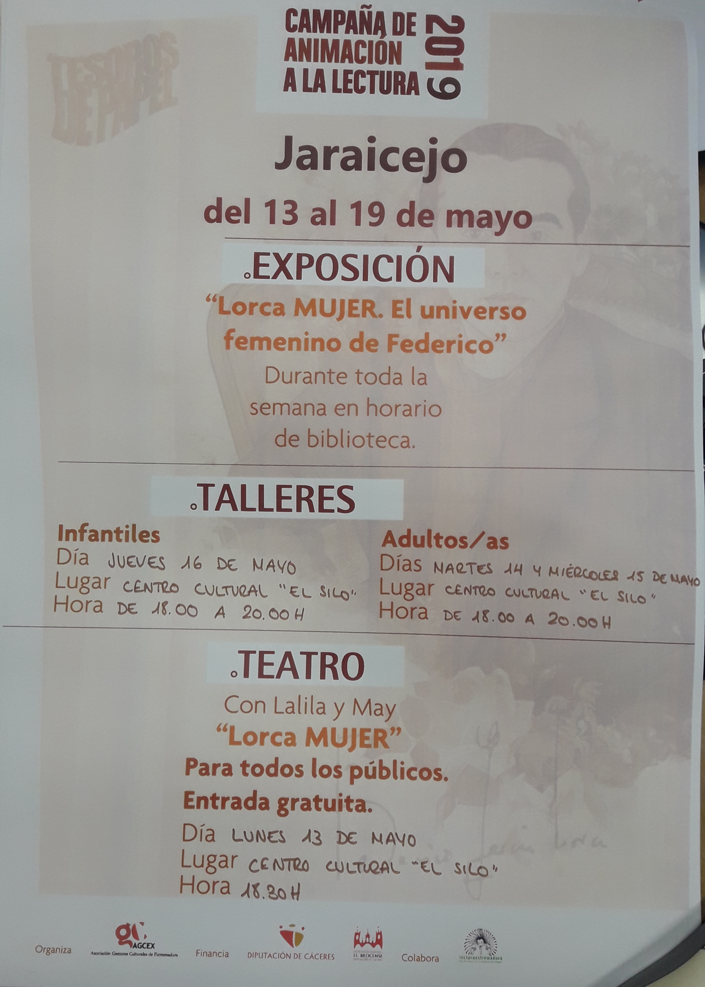 - El día 13 de mayo: Representación teatral "Lorca MUJER" a las 18.30h en el Centro Cultural "El Silo".